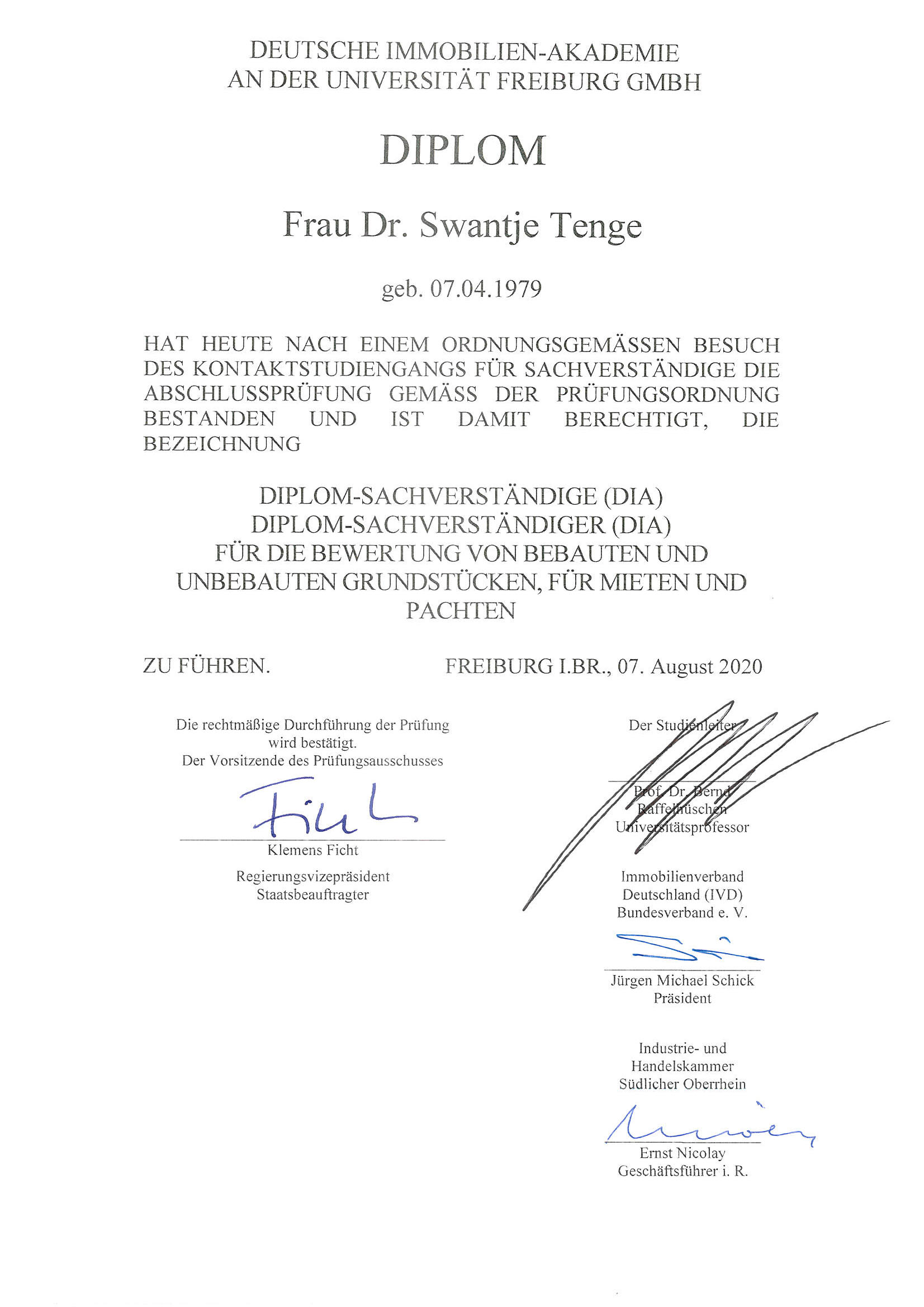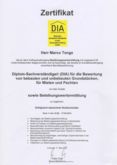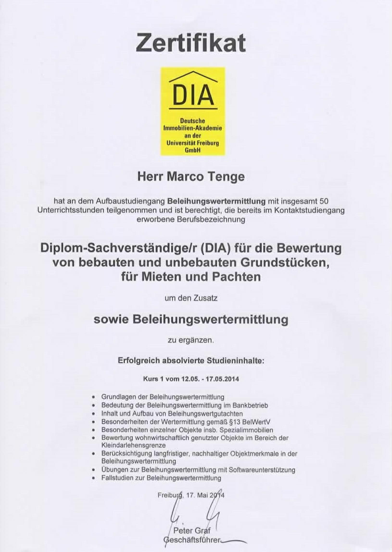 Diplom-Sachverständiger (DIA an der Universität Freiburg) für die Bewertung von bebauten und unbebauten Grundstücken, für Mieten und Pachten