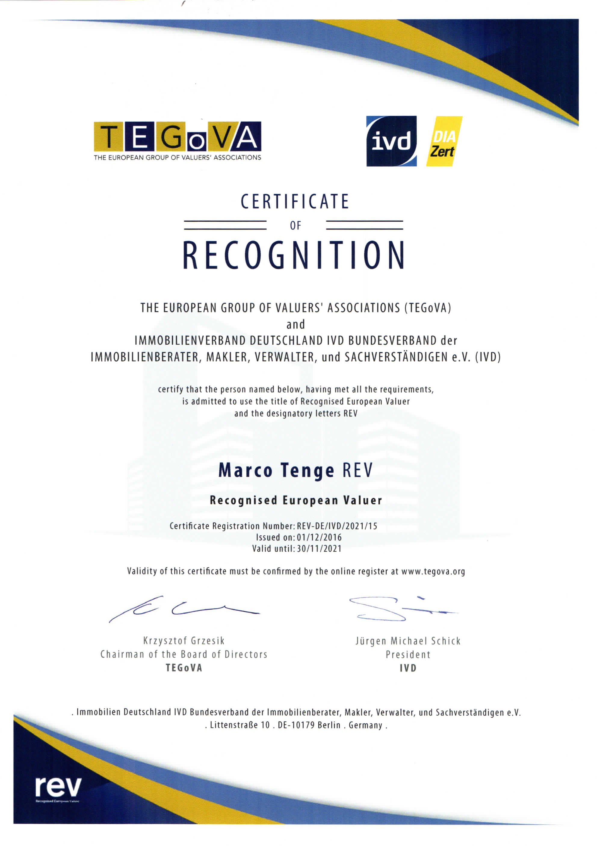 Recognised European Valuer (REV)